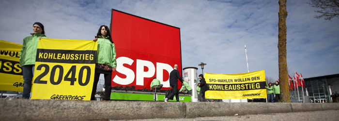 Den stärksten politischen Rückhalt genießt die Kohleverstromung bei Politikern der SPD. Greenpeace-Aktivisten demonstrierten deshalb am 14. April beim SPD-Bundesparteitag in Augsburg für einen raschen Umstieg auf erneuerbare Energiequellen. Neben Transparenten brachten sie ein fünf Meter hohes SPD-Logo mit. Davor errichteten sie eine rund zweieinhalb Meter hohe Mauer aus Kohlebriketts, hinter der die drei weißen Buchstaben symbolträchtig verschwanden, bis die Mauer zum Einsturz gebracht wurde. Foto: Daniel Müller/Greenpeace