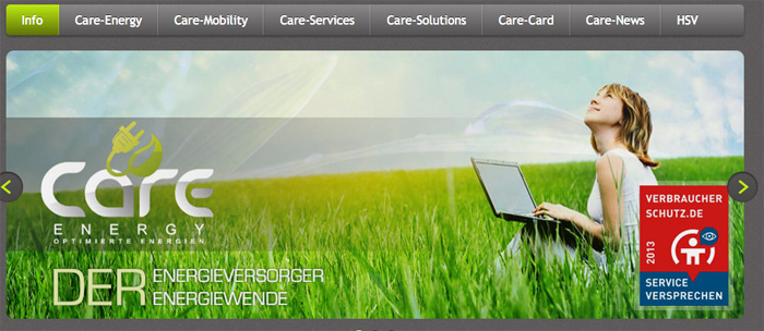 "Der Verbraucherschutz empfiehlt Care-Energy" hieß es in einem weiteren dieser PR-Texte. Und tatsächlich prangt auf der Internet-Startseite des Unternehmens ein Emblem, das den Eindruck erweckt, als ob eine Verbraucherschutzorganisation das Unternehmen getestet habe und es empfehlen würde (siehe Foto). Das Emblem "verbraucherschutz.de" ist freilich erkauft. Es ist sogar von noch geringerem Wert als die "Testsiegel", die das sogenannte "Deutsche Institut für Service-Qualität" produziert (130316). Es wird nämlich nicht einmal der Anschein eines Tests erweckt, sondern lediglich ein von den zahlenden Unternehmen gegebenes "Service-Versprechen" veröffentlicht, das die Seriösität des Unternehmens belegen soll. Typische Kunden dieser Augenwischerei-Dienstleistung sind Schlüsseldienste und Bestattungsunternehmen...