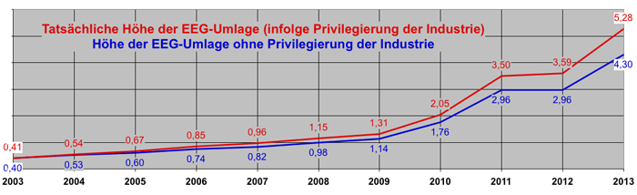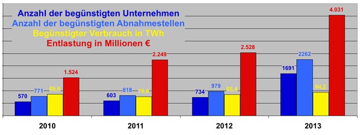 Infolge des Anstiegs der EEG-Umlage von 3,59 auf 5,28 Cent pro Kilowattstunde ergab sich dennoch eine starke Zunahme der finanziellen Entlastung aller "privilegierten" Großstromverbraucher, die bei den übrigen Letztverbrauchern als zusätzliche Belastung zu Buche schlägt: Sie stieg von 2,5 auf über vier Milliarden Euro. Das sind 60 Prozent mehr als im Vorjahr.