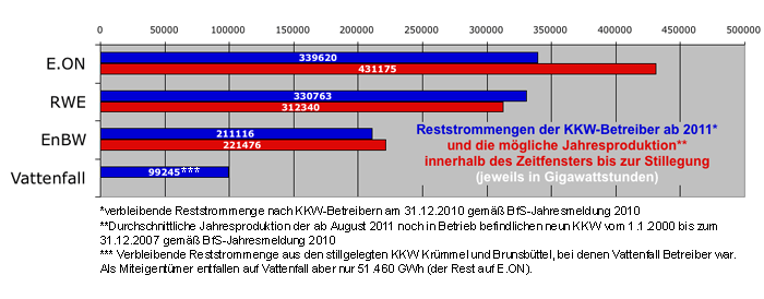 Die 2011 beschlossene Neufassung des Atomgesetzes setzte die Reststrommengen, die den vier KKW-Betreibern in der ab 2002 gültigen Ausstiegsregelung zugestanden worden waren, wieder in Kraft, kombinierte sie aber zugleich mit festen Schlußterminen für die Laufzeit der einzelnen Reaktoren. Wie diese Grafik zeigt, bekamen E.ON und EnBW genug Spielraum, um ihre jeweiligen Reststrommengen innerhalb des Zeitfensters bis zur Stillegung der Anlagen abzuarbeiten (bei E.ON inklusive der Reststrommengen von Vattenfall). RWE wurde es dagegen nicht ganz leicht gemacht, auch die fiktive Reststrommenge für Mülheim-Kärlich bis zur letzten Gigawattstunde ausschöpfen zu können. (Die Grafik basiert auf den Reststrommengen, die das Bundesamt für Strahlenschutz zum 31.12.2010 ermittelte. Für die neun Kernkraftwerke, die nach § 7 Abs. 1a AtG weiter in Betrieb blieben, wurde die durchschnittliche Jahresproduktion zugrunde gelegt, die sie im Zeitraum von 2000 bis 2007 erreichten.) |