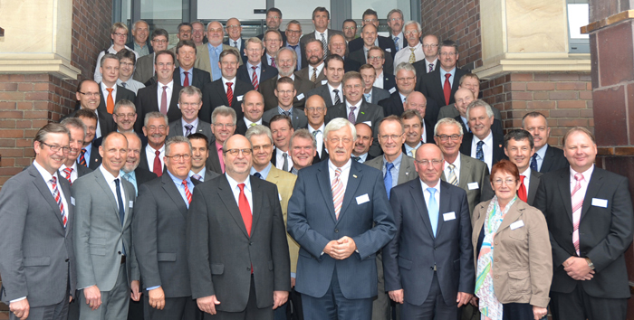 Insgesamt 48 Bürgermeister, Landräte und sonstige Bevollmächtigte haben am 24. Juni in Paderborn den Beitritt ihrer Kommunen zum neuen Unternehmen Westfalen Weser Energie GmbH & Co KG erklärt. Größte Anteilseigner sind die Städte Paderborn und Herford, die auf diesem Gruppenfoto in der ersten Reihe durch ihre Bürgermeister Heinz Paus (5.v.l.) und Bruno Wollbrink (4.v.l.) repräsentiert werden. Foto: SW Herford