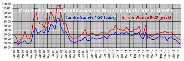 Die seit 2009 andauernde Talfahrt der Strompreise am Spotmarkt erreichte im Juni mit 27,82 Euro pro Megawattstunde (base) einen weiteren Tiefpunkt. Sie bringt vor allem die Betreiber neuer Gaskraftwerke unter Druck, die ihre Anlagen zu Zeiten wesentlich höherer Börsenstrompreise geplant haben und deren Kalkulation nun nicht mehr aufgeht. Die Branche verweist deshalb gern auf die Notwendigkeit, konventionelle Kraftwerkskapazitäten zum Ausgleich des schwankenden Aufkommens an Wind- und Solarstrom vorhalten zu müssen. Zum großen Teil will sie mit ihrem Ruf nach subventionierten "Kapazitätsmärkten" aber nur den Abbau von überflüssig gewordenen konventionellen Kraftwerken verhindern. Ursache des Preisverfalls am Spotmarkt ist übrigens die "marktwirtschaftliche" Umgestaltung des EEG-Ausgleichsmechanismus, mit der die früher separat behandelten EEG-Strommengen an die Börse gelenkt wurden – zum Nachteil der Stromverbraucher, die im Unterschied zu den Stromvertrieben keinerlei Nutzen von den gesunkenen Spotmarktpreisen haben, sondern vielmehr durch einen wesentlichen Anstieg der EEG-Umlage belastet werden (120204). Es könnte durchaus sein, daß sie demnächst auch noch eine "marktwirtschaftliche Lösung" zur Subventionierung konventioneller Kraftwerkskapazitäten über ihre Stromrechnung finanzieren müssen... |