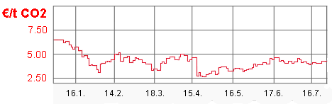 Auch in der seit Jahresbeginn laufenden dritten Handelsperiode sind die Preise für die CO2-Zertifikate viel zu niedrig, um einen effektiven Beitrag zum Klimaschutz leisten zu können. Ende Juli kostete die Emissionsberechtigung für eine Tonne Kohlendioxid lediglich etwas mehr als vier Euro. Zeitweilig waren die "EU Emission Allowances" (EUA) schon für 2,65 Euro zu haben. Quelle: EEX