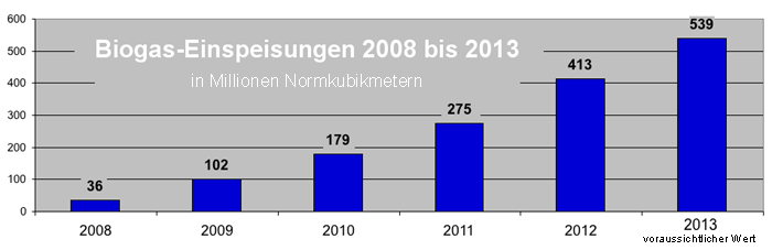 Die Zahl der Biogasanlagen, die ins Gasversorgungsnetz einspeisen, hatte sich Ende 2012 von 77 auf 108 erhöht. Die eingespeiste Biogas-Menge stieg von 275 auf rund 413 Millionen Kubikmeter. Das normierte Ziel von sechs Milliarden Kubikmeter bis zum Jahre 2020 wurde bisher aber lediglich um 6,88 Prozent erfüllt. Auch im günstigsten Falle wurde nach Feststellung der Bundesnetzagentur "das Mengenziel 2020 ersichtlich weit verfehlt". Dasselbe gilt für die zehn Milliarden Kubikmeter, die bis zum Jahre 2030 erreicht werden sollen.