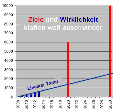 Bei linearer Fortschreibung der bisherigen Entwicklung sei eine "deutliche Zielverfehlung" zu erwarten, heißt es in dem Bericht der Bundesnetzagentur. Das ist sehr milde formuliert, wie diese Grafik zeigt. Aber es wäre auch keineswegs sinnvoll, die Bioenergien derart zu forcieren, wie das in § 31 der Gasnetzzugangsverordnung vorgesehen ist. |
