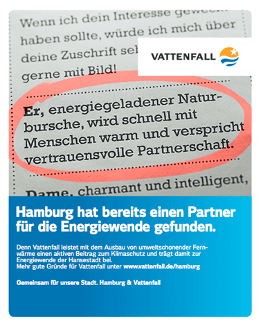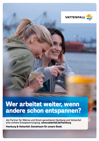 In Hamburg ist der Vattenfall-Konzern gewissermaßen Wiederholungstäter, denn er wurde hier schon im November vorigen Jahres von der Verbraucherzentrale wegen irreführender Werbung durch Vermischung von Netz und Vertrieb abgemahnt (121121). Im Mai und Juni 2013 startete er nach demselben Muster eine neue Werbekampagne. Mit insgesamt drei Anzeigenmotiven stellte er sich in Zeitungen, auf Plakaten und in Kinos als unermüdlich tätiger Garant einer sicheren Stromversorgung vor. Etwa mit dem Spruch: "Wer arbeitet weiter, wenn andere schon entspannen? Als Partner für Wärme und Strom garantieren Hamburg und Vattenfall eine sichere Energieversorgung. www.vattenfall.de/hamburg". Absender der Botschaft war also nicht die für die Versorgungssicherheit zuständige Stromnetz Hamburg GmbH, sondern Vattenfall. Und auch die Internetadresse, die unmittelbar auf den Satz zur Versorgungssicherheit folgte, führte auf die Internetseiten von Vattenfall.