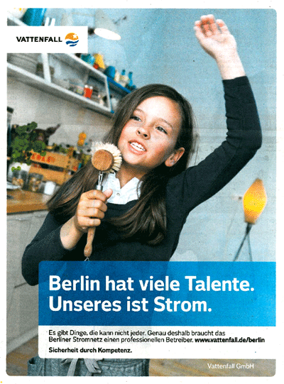 In Berlin hatte die Vattenfall GmbH ebenfalls im Mai eine Anzeige geschaltet, um der damals laufenden Unterschriftensammlung für ein Volksbegehren zur Rekommunalisierung der Stromversorger das Wasser abzugraben. Darin hieß es: "Berlin hat viele Talente. Unseres ist Strom. Es gibt Dinge die kann nicht jeder. Genau deshalb braucht das Berliner Stromnetz einen professionellen Betreiber. www.vattenfall.de/Berlin. Sicherheit durch Kompetenz".