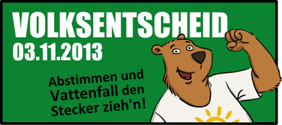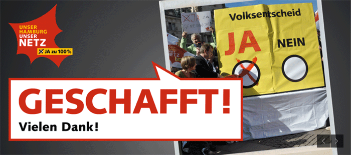 Wegen der zunehmenden Unzufriedenheit mit Vattenfall und der gesamten Privatisierung im Energiebereich, zu deren Sprecher sich die damals mitregierenden Grünen machten, kam es 2009 zur Gründung der "Hamburg Energie" als neuem kommunalen Vertriebsunternehmen für Strom (090511, 130511). Außerdem erwarb der Senat, der seit 2011 wieder allein von der SPD gestellt wird, von Vattenfall und E.ON jeweils eine Viertelbeteiligung an den Netzen für Strom, Gas und Fernwärme (111107). Aus der so entstandenen "Vattenfall Stromnetz Hamburg GmbH" verschwand ab April 2013 der Name Vattenfall (130309). Dies alles reichte freilich nicht aus, die Kampagne für einen Volksentscheid über die Rekommunalisierung der Netze zu bremsen, die ein breites Bündnis von Organisationen und Einzelpersonen unter dem Motto "Unser Hamburg – unser Netz" betrieb (120313). Auch eine massive Werbekampagne, die Vattenfall kurz vor dem Volksentscheid unter Verletzung der Vorschriften für die operationelle Entflechtung von Netz und Vertrieb startete (130812), fruchtete nicht viel, wie das Ergebnis der Abstimmung zeigt.