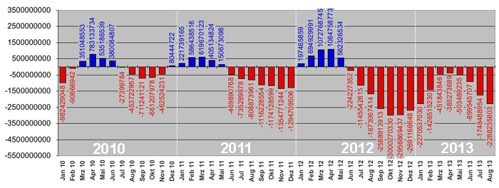 Wie verhängnisvoll sich der neue "Ausgleichsmechanismus" auswirkt und wie stark er die Verbraucher zusätzlich zur EEG-Einspeisungsvergütung belastet, zeigt das aktuelle Ergebnis vom August 2013: Die Übertragungsnetzbetreiber zahlten für den eingespeisten EEG-Strom insgesamt 2,3 Milliarden Euro als Einspeisungsvergütungen oder in modifizierter Form als "Marktprämien" (130201). Beim Pflichtverkauf des ihnen verbleibenden EEG-Stroms an der Börse bekamen sie aber lediglich 223 Millionen Euro. Es entstand so ein Defizit von 2,1 Milliarden Euro, das auch die gleichzeitigen Einnahmen von 1,57 Milliarden Euro aus der bereits sehr hohen EEG-Umlage nicht zu decken vermochten. Unterm Strich schloß die Gesamtrechnung des Monats mit einem Defizit von 540 Millionen Euro ab.