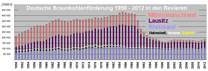 Mit dem Ende der DDR ging die Braunkohleförderung in den Revieren Mitteldeutschland (Mibrag) und Lausitz (Laubag bzw. Vattenfall) stark zurück. In den alten Bundesländern – deren Anteil in dieser Grafik durch die weiße Linie markiert wird – blieb sie dagegen auf annähernd demselben Niveau. Sie entfällt hier zu fast hundert Prozent auf das rheinische Revier (Rheinbraun bzw. RWE). Die drei weiteren Reviere um Helmstedt, in Hessen und Bayern spielten nie eine bedeutende Rolle. In den beiden letzteren wurde mit der Braunkohleverstromung auch die Förderung inzwischen ganz eingestellt. Das Helmstedter Revier wird voraussichtlich bis 2017 erschöpft sein. Die Mibrag, die es soeben gekauft hat, will dann aber das dazugehörige Kraftwerk Buschhaus mit mitteldeutscher Braunkohle weiter betreiben (130907). Quelle: www. kohlenstatistik.de