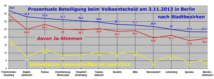 "Der Volksentscheid war ein großer Erfolg, aber aufgrund des festgelegten Quorums von 25 Prozent Zustimmung aller Berliner Wahlberechtigten kein Sieg", resümierte die Bügerinitiative. Entscheidend für das Nichterreichen des Quorums sei die Verlegung der Volksentscheids auf den 3. November gewesen, anstatt ihn – wie in Hamburg – mit der Bundestagswahl zu koppeln. Der Berliner Senat habe so dem Anliegen der Bürgerinitiative erfolgreich "Felsbrocken in den Weg gelegt". Zugleich habe er Mehrkosten von mindestens 1,8 Millionen Euro zu Lasten der Steuerzahler verursacht.