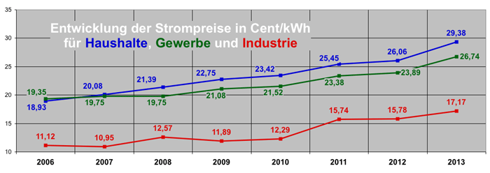 Etwas flacher verlief der Anstieg der Strompreise für Gewerbekunden (um 12,8 Prozent auf durchschnittlich 26,74 Cent/kWh). Deutlich besser kam die Industrie davon, die bei einem mittleren Strompreis von 17,17 Cent/kWh nur um 9,9 Prozent mehr belastet wurde.