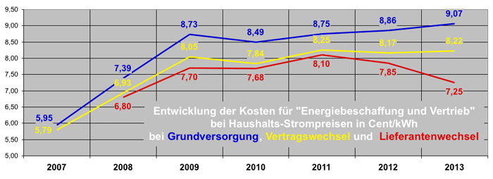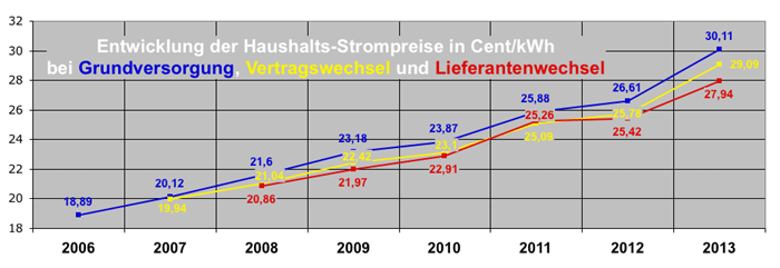 In der Grundversorgung zahlten Haushaltskunden am 1. April 2013 sogar durchschnittlich 30,11 Cent pro Kilowattstunde und damit 13,2 Prozent mehr als am Stichtag des Vorjahres. Wer einen günstigeren Vertrag beim selben Versorger hatte, zahlte im Schnitt 29,09 Cent/kWh (plus 12,8 Prozent). Beim Wechsel zu einem anderen Lieferanten waren es 27,94 Cent/kWh oder 9,9 Prozent.