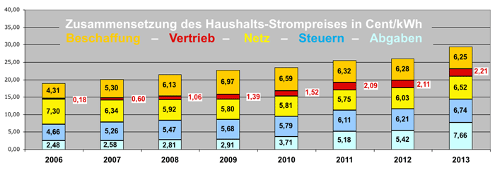 Der ungewöhnlich starke Anstieg der Strompreise von 2012 bis 2013 ist fast nur auf Abgaben und Steuern zurückzuführen. Quelle: Monitoringbericht 2013 |