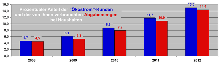 Die Zahl der Haushaltskunden, die vermeintlichen "Ökostrom" beziehen, hat sich von 2008 bis 2012 mehr als verdreifacht. Die Struktur des vorhandenen Kraftwerksparks wurde dadurch freilich nicht nennenswert beeinflußt, sondern lediglich die Art seiner Vermarktung. Das gilt sowohl für die Augenwischerei mit RECS- und EECS-Zertifikaten als auch für "echten" Strom aus erneuerbaren Energien, der irgendwo mengengleich ins Netz eingespeist wird. Das Geschäft lebt in beiden Fällen von Illusionen. Quelle: Monitoringbericht 2013 |