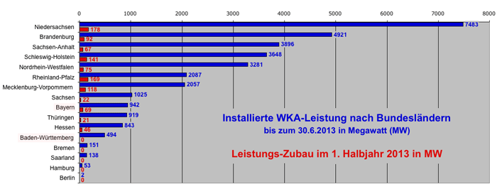 Baden-Württemberg und Bayern gehören bei der Windstromerzeugung zu den Schlußlichtern. Vor allem im Südweststaat gibt es relativ wenige gute Standorte. Die grün-rote Landesregierung in Stuttgart und die CSU-Landesregierung in München wollen trotzdem den Ausbau dieser Stromquelle forcieren, indem sie auch für schlechte Standorte eine Förderung verlangen, die den Betrieb von Windkraftanlagen rentabel macht. Im Bundesland Schleswig-Holstein – das weniger als halb so groß ist wie Baden-Württemberg, aber über mehr als siebenmal soviel WKA-Kapazitäten verfügt – fehlt es dagegen nicht an windgünstigen Standorten. Hier protestiert die Landesregierung bzw. die Windkraft-Lobby gegen die geplante Steuerung des Zubaues durch einen "atmenden Deckel" wie bei der Photovoltaik. Quelle: DEWI