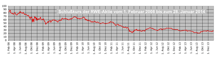 Im Vergleich mit dem Anfang 2008 erreichten Höchststand ist der Kurs der RWE-Aktie inzwischen auf weniger als ein Drittel gesunken. |