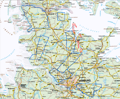 In weiten Teilen Schleswig-Holsteins haben die Gas- und Ölkonzerne bereits ihre "Claims" abgesteckt: Bei den blau umrandeten Gebieten handelt es sich um neu genehmigte "Aufsuchungen" und bei den rot markierten um neu genehmigte "Bewilligungen".