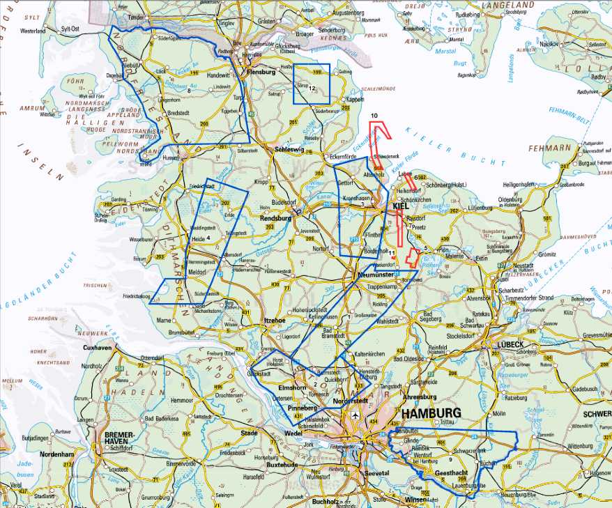 In weiten Teilen Schleswig-Holsteins haben die Gas- und Ölkonzerne bereits ihre "Claims" abgesteckt: Bei den blau umrandeten Gebieten handelt es sich um neu genehmigte "Aufsuchungen" und bei den rot markierten um neu genehmigte "Bewilligungen". |