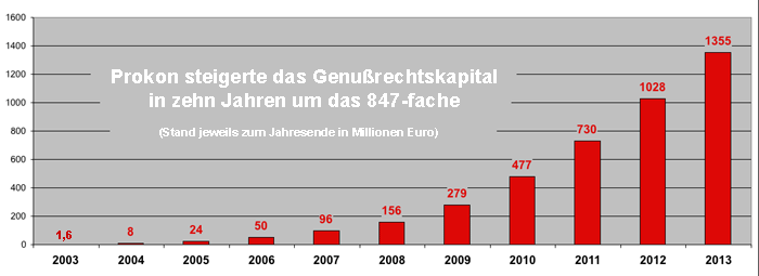 In der Tat gelang es Rodbertus auf diese Weise, die auf den Windparks lastenden Schulden abzulösen und die Auflagen der Bafin zu erfüllen. Laut den im "Bundesanzeiger" veröffentlichten Geschäftsberichten stieg die Darlehenssumme, die die Prokon Regenerative Energien GmbH & Co. KG anderen Gesellschaften der Unternehmensgruppe zur Verfügung stellte, von Ende 2008 bis Ende 2009 von 150,2 auf 278,5 Millionen Euro. Das war ein Zuwachs um gut 128 Millionen Euro. Bis Ende 2010 hatten 28.407 Anleger insgesamt 477 Millionen Euro in Prokon-Genußscheine investiert. Ein Jahr später waren es bereits 730 Millionen Euro. Als das Genußrechtekapital 2013 auf knapp 1,4 Milliarden stieg, nannte Prokon-Chef Rodbertus als "vorläufiges Zeichnungsziel" sogar 12 Milliarden Euro.