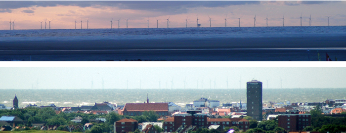 Norderney aus (unten) sind die 30 Windkraftanlagen zu sehen.