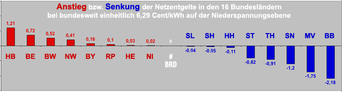 Als Lösung schlägt das Gutachten eine Modifizierung der "Anreizregulierung" vor, die seit 2009 praktiziert wird, damit die Netzbetreiber möglichst sparsam und effizient wirtschaften (071103). Aus den regional unterschiedlichen Netzkosten soll die Bundesnetzagentur künftig für jede Netzebene einen Mittelwert bilden, der dann bundesweit für eine einheitliche Belastung der Stromverbraucher durch die Netzentgelte sorgt. Zum Beispiel hätte sich so 2013 auf der Niederspannungsebene – also für alle Haushaltskunden und sonstigen Kleinverbraucher – ein einheitliches Netzentgelt von 6,29 Cent pro Kilowattstunde ergeben. Den Brandenburgern hätte dies eine Verringerung ihrer Stromrechnungen um 2,18 Cent/kWh beschert. Aber auch alle anderen ostdeutschen Haushalte wären entlastet worden sowie - in deutlich bescheidenerem Umfang – die Haushalte in Hamburg, Schleswig-Holstein und Saarland. Umgekehrt müßten die Verbraucher der übrigen Bundesländer einen Anstieg ihrer Stromrechnungen hinnehmen, der in Bremen mit 1,21 Cent/kWh und in Berlin mit 0,72 Cent/kWh am höchsten wäre (siehe Grafik).