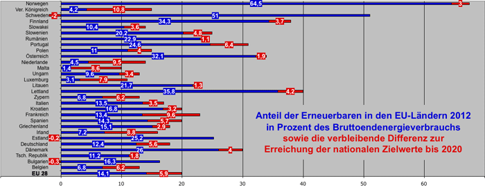 Am besten ist Norwegen dran, das bei relativ geringer Bevölkerungszahl über soviel elektrische Energie aus Wasserkraft verfügt, daß es mit dieser sogar den Wärmebedarf weitgehend decken und schon jetzt zwei Drittel der Endenergie mit Erneuerbaren bestreiten kann. Es gehört zwar nur dem Europäischen Wirtschaftsraum (EWR) an, wird aber von Eurostat ergänzend mitaufgelistet. Unter den 28 EU-Staaten ist Schweden der Musterknabe, indem es mehr als die Hälfte seines Endenergiebedarfs aus Erneuerbaren deckt und bereits 2012 den nationalen Zielwert von 49 Prozent um zwei Prozent überschritten hatte. Auch Estland und Bulgarien hatten ihre Zielwerte 2012 bereits erreicht und leicht überschritten. Deutliche Zunahmen gegenüber 2004 verzeichneten ferner Dänemark (von 14,5 auf 26,0 Prozent), Österreich (von 22,7 auf 32,1 Prozent), Griechenland (von 7,2 auf 15,1 Prozent) und Italien (von 5,7 auf 13,5 Prozent). Im Rückstand befanden sich dagegen Großbritannien, die Niederlande, Luxemburg und Malta.