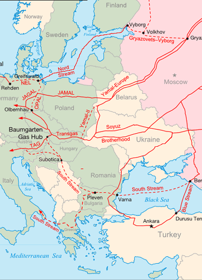 Um die Ukraine mit großen Gasmengen aus der EU zu versorgen, müßte die Schubumkehr über die "Transgas"-Pipeline ermöglicht werden, die ab der ukrainischen Westgrenze die aus Sibirien kommende "Brotherhood"-Pipeline fortsetzt. Über diese mehrspurige "Gasautobahn" durch die Ukraine, die Slowakei und Tschechien flossen früher rund 80 Prozent der russischen Erdgaslieferungen nach Europa. Spätestens seit der Inbetriebnahme der Ostsee-Pipeline "Nord Stream" (111101) gibt es hier genug freie Kapazität, um eine oder mehrere der Röhren in der Gegenrichtung zu betreiben. In Tschechien hat man die technischen Voraussetzungen für die Schubumkehr bereits geschaffen. Auch die Slowakei kann inzwischen von Westen her mit Gas beliefert werden. Eine volle Nutzung der brachliegenden Kapazitäten der Transgas-Pipeline zur Versorgung der Ukraine aus dem Westen wäre ebenfalls realisierbar. Sie kam bisher aber nicht zustande, weil die slowakische Regierung Angst vor russischen Repressalien und Gazprom zu großen Einfluß auf den slowakischen Netzbetreiber Eustream hat.