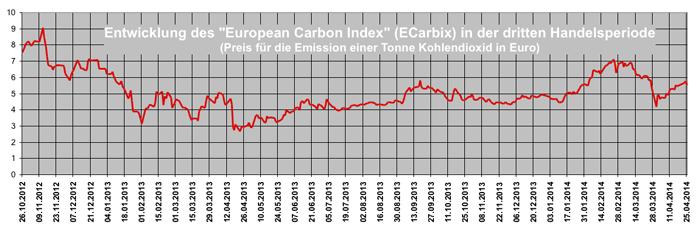 Für die dritte Handelsperiode von 2013 bis 2020 wurden wiederum viel zu viele Zertifikate ausgegeben, wodurch die Preise von Anfang an im Keller verharrten und keinen Druck zur Minderung der CO2-Emissionen ausübten. Um dem abzuhelfen, will die EU-Kommission die Zahl der ausgegebenen Zertifikate vorübergehend verknappen und mit Beginn der vierten Handelsperiode im Jahr 2021eine "Marktstabilitätsreserve" einführen (140109). Möglicherweise als Folge dieses Beschlusses stieg der Preis, der bis Anfang April auf 4,75 Euro gesunken war, bis Ende des Monats auf 5,52 Euro. Um tatsächlich eine nennenswerte Wirkung für den Klimaschutzwirkung zu haben, müßte er aber ungefähr viermal so hoch sein.