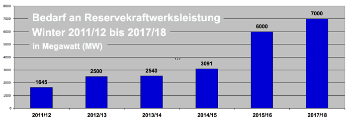 Die Bundesnetzagentur erwartet einen starken Anstieg des Bedarfs an Reservekraftwerksleistung. Im bevorstehenden Winter wird er um etwa ein Fünftel zunehmen, im darauffolgenden Jahr aber annähernd um das Doppelte. Als Grund dafür nennt die Behörde die zunehmende Einspeisung von Strom aus regenerativen Energien im Norden Deutschlands, die Abschaltung von Kernkraftwerken vor allem im verbrauchsintensiven Süden Deutschlands, die Verzögerungen beim Neubau von Leitungen sowie die hohen Exporte in südliche Nachbarländer. Das so bewirkte Nord-Süd-Gefälle beim Stromtransport im Übertragungsnetz könne besonders bei winterlichen Verbrauchssituationen zu Engpässen führen, die sich bei der gegenwärtigen Verteilung des Kraftwerksparks nicht mehr mit "Redispatch"-Maßnahmen ausgleichen lassen, sondern die zeitweilige Aktivierung von zusätzlichen Kraftwerkskapazitäten erfordern.