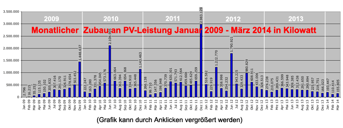 Seit 2009 müssen Solarstromerzeuger ihre Anlagen der Bundesnetzagentur melden, um die EEG-Förderung beanspruchen zu können (090813). Besonders auffällig sind bei dieser grafischen Darstellung des monatlichen Zubaues bis März 2014 die Rekorde, die bis 2012 wiederholt im Dezember und im Juni auftraten. Sie hatten damit zu tun, daß jeweils im folgenden Monat Abstriche an der EEG-Förderung in Kraft traten: So wurden ab 1. Januar 2010 die Vergütungen um jeweils acht Prozent gesenkt (080507, 080601). Am 1. Juli 2010 folgte eine weitere Senkung um 11 bis 16 Prozent (100501, 100701). Einen absoluten Höchststand erreichte die Zahl der Anmeldungen zum Jahresende 2011, weil ab 2012 das novellierte EEG die Vergütungen für Solarstrom um neun Prozent kürzte (110201). Aber alle diese Abstriche reichten nicht aus, um den Photovoltaik-Boom zu bremsen (120101, 120201). Ab Frühjahr 2012 gab es deshalb weitere gesetzliche Veränderungen, die eine anhaltende Torschlußpanik begünstigten (120301, 120504, 120602) und zu noch mehr PV-Zubau als im Vorjahr führten (130203). Erst 2013 hinterließen die im Sommer 2012 beschlossenen Kürzungen der Förderung deutliche Bremsspuren (130706). |