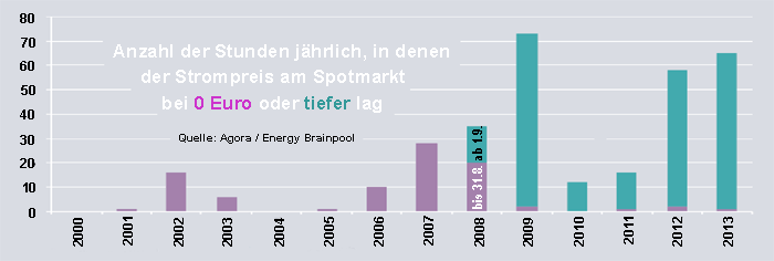 Die seit Ende 2008 immer wieder auftretenden negativen Preise am Spotmarkt der Strombörse sind "nicht Ausdruck einer Überschußsituation von Strom aus Erneuerbaren Energien, sondern auf mangelnde Flexibilität des Stromsystems zurückzuführen". Zu diesem Schluß gelangt eine Studie, die im Auftrag der Initiative "Agora Energiewende" von dem Consulting-Unternehmen Energy Brainpool erstellt und am 10. Juni veröffentlicht wurde. Sie untersucht die 97 Stunden mit negativen Strompreisen, die zwischen Dezember 2012 und Dezember 2013 bei der vortägigen Auktion an der Expex Spot (091209) auftraten. Sie gelangt zu dem Ergebnis, daß die konventionelle Stromerzeugung nicht so zurückgefahren wurde, wie es die Erzeugung an Wind- und Solarstrom erfordert hätte, und daß die so entstandenen Negativpreise das EEG-Konto um fast 90 Millionen Euro belastet haben. Dabei habe der Erneuerbaren-Anteil an den Verkäufen am Spotmarkt selbst bei Starkwind beziehungsweise hoher Solarstromproduktion zu keinem Zeitpunkt mehr als 65 Prozent des Stromverbrauchs betragen. Ein Erneuerbaren-Anteil in dieser Höhe könne als durchaus angemessen gelten, sofern man das im EEG verankerte Ziel des Ausbaues der Erneuerbaren Energien und deren Einspeisevorrang nicht in Frage stellen wolle.