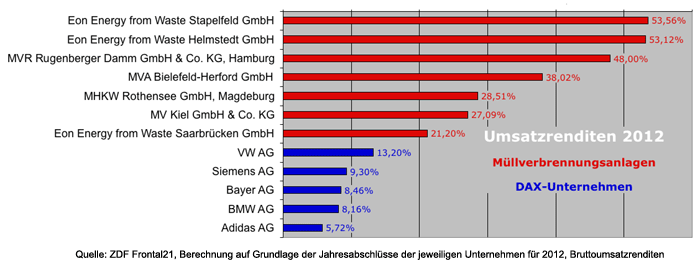 Die ZDF-Sendung "frontal21" hatte sich bereits im Oktober 2008 und im Februar 2012 mit dem Thema befaßt. Sie untersuchte dabei neun der insgesamt rund siebzig Müllverbrennungsanlagen, die es in Deutschland gibt. Bei allen waren die Gebühren weit höher, als es die Kostendeckung erfordert hätte. Die Renditen übertrafen sogar deutlich die von DAX-Unternehmen. Spitzenreiter waren die E.ON-Müllverbrennungsanlagen Helmstedt und Stapelfeld bei Hamburg mit Bruttoumsatzrenditen von über 50 Prozent (siehe Grafik). Inzwischen gehört die E.ON Energy from Waste mehrheitlich einem schwedischen Finanzinvestor(121208) und wurde in EEW Energy from Waste umbenannt (130907).