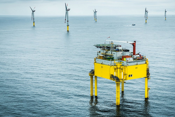 Die 80 Anlagen des Windparks Global Tech 1 sind betriebsbereit aufgestellt und über Wechselstromkabel mit der Umspannstation (Vordergrund) verbunden. Was noch fehlt, ist die Weiterleitung des erzeugten Stroms per Hochspannung-Gleichstrom-Übertragung (HGÜ). Diese Aufgabe soll die HGÜ-Verbindung BorWin2 übernehmen, die aber erst 2015 fertig wird. Foto: Global Tech