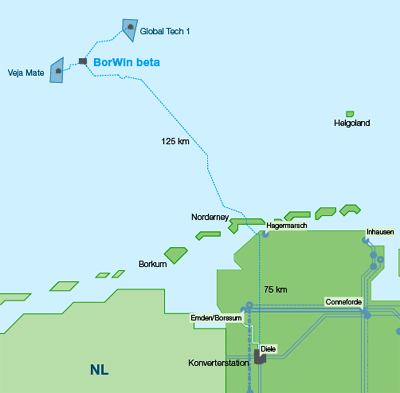 Über die Konverterplattform BorWin beta werden sowohl Global Tech 1 als auch Veja Mate an die HGÜ-Verbindung BorWin2 angeschlossen, die den erzeugten Strom über ein 125 Kilometer langes Seekabel zum Festland transportiert. Eine zweite Konverterstation beim Umspannwerk Diele wandelt den Gleichstrom wieder in Wechselstrom um. Grafik: TenneT