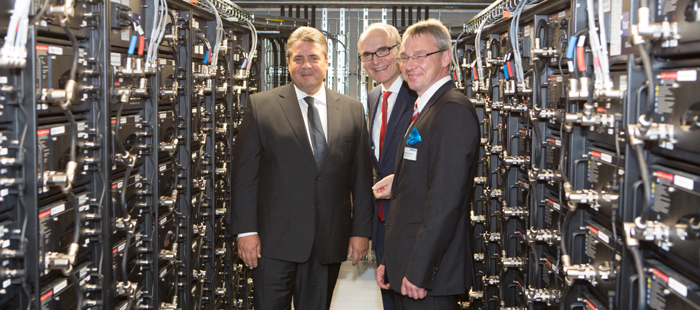 Zur Inbetriebnahme des neuen Batteriespeichers erschienen Bundeswirtschaftsminister Sigmar Gabriel und der Schweriner Ministerpräsident Erwin Sellering. Rechts Wemag-Vorstand Thomas Pätzold. |