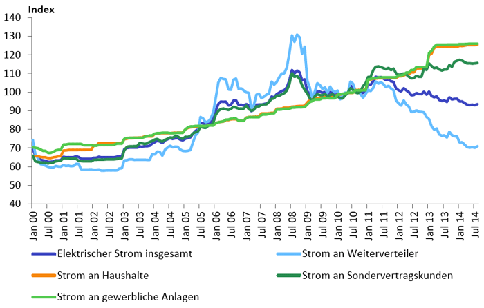 Für Weiterverteiler (hellblau) war Strom im August 2014 um rund vier Prozent billiger als im Januar 2000. Für Haushalte und gewerbliche Kleinverbraucher (hellgrün und gelb) hat er sich dagegen mit einem Anstieg um rund 92 Prozent fast verdoppelt. Grafik: Statistisches Bundesamt