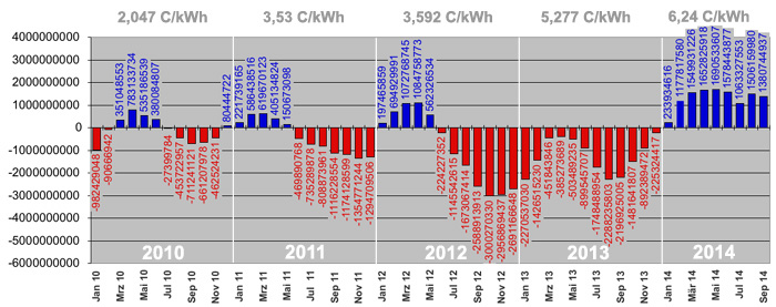 Die leichte Absenkung der EEG-Umlage kam nicht überraschend, nachdem sich bereits zu Jahresbeginn herausstellte, daß 2013 die EEG-Kosten zum ersten Mal seit Bestehen des EEG gegenüber dem Vorjahr nicht gestiegen, sondern gesunken waren (140103). Dies hatte damit zu tun, daß die EEG-Einspeisung mit 125.872 Gigawattstunden nur etwa 94 Prozent des prognostizierten Werts von 132.519 Gigawattstunden erreichte. Es handelte sich also nicht um eine Trendwende – etwa durch die fortschreitende Umstellung des Subventionsmodells auf Direktvermarktung – sondern um einen Mengeneffekt. Obwohl das EEG-Konto das ganze Jahr 2013 über nicht aus den roten Zahlen herausgekommen war, ergab sich so gegenüber dem Vorjahr eine Verringerung der Gesamtkosten um 690 Millionen Euro. Die mit Jahresbeginn 2014 kräftig erhöhte EEG-Umlage von 6,24 Cent/kWh sorgte dann ab Januar 2014 wieder für kräftige Überschüsse auf dem EEG-Konto, wobei sogar der übliche Abstieg in die roten Zahlen, der bisher für die zweite Jahreshälfte typisch war, zumindest bis September völlig ausblieb (siehe Grafik 1).