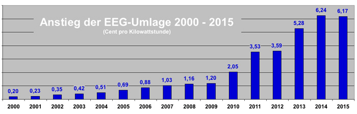 Die EEG-Umlage wird im kommenden Jahr 6,17 Cent pro Kilowattstunde betragen. Dies gaben die vier deutschen Übertragungsnetzbetreiber und die Bundesnetzagentur am 15. Oktober bekannt. Die Umlage sinkt damit zum ersten Mal seit Bestehen des Erneuerbare-Energien-Gesetzes. Die Absenkung ist mit 0,07 Cent allerdings sehr gering und ändert praktisch nichts an der inzwischen erreichten hohen Belastung des Strompreises. Außerdem wird auch das neue EEG, das zum 1. August in Kraft (140601), die Kosten voraussichtlich weiter steigen lassen. In ihrer Mittelfristprognose erwarten die Übertragungsnetzbetreiber von 2014 bis 2018 eine Zunahme der EEG-Einspeisungen um 34 Prozent und der dafür gezahlten Vergütungen um 22 Prozent.