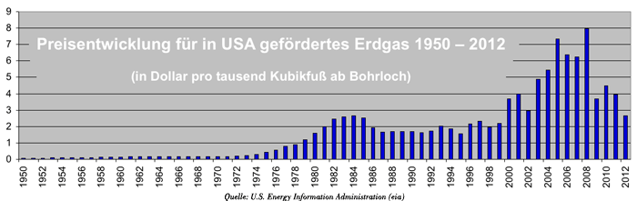 Grundsätzlich lohnt sich jede Art von Fracking erst bei einer bestimmten Höhe des Gaspreises. Deshalb dauerte es in den USA bis in die siebziger Jahre, ehe mit Schiefergas-Fracking begonnen wurde. Damals stieg der Erdgas-Förderpreis von 1972 bis 1984 kontinuierlich von 0,19 auf 2,66 Dollar pro tausend Kubikfuß. Einen neuen Schub erhielt die Technologie mit dem Nachlassen der konventionellen US-Förderung und einem daraus resultierenden Preisanstieg ab dem Jahr 2000: Nun kletterte Preis für tausend Kubikfuß ab Bohrloch binnen neun Jahren von 2,19 auf 7,97 Dollar (siehe Grafik 2).
