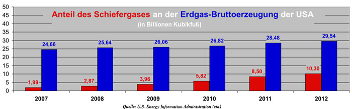 Binnen fünf Jahren stieg die Schiefergas-Produktion der USA um das Fünfzehnfache und stellte 2012 rund ein Drittel der gesamten Gasförderung. |