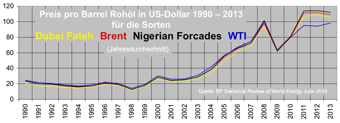 Seinen Höhepunkt erreichte der seit 2004 andauernde Ölpreisanstieg im Juli 2008, als beispielsweise die Sorte Brent mit bis zu 147,50 Dollar gehandelt wurde. Im Jahresdurchschnitt 2008 kostete sie 97,26 Dollar. Im Vergleich mit den 12,72 Dollar vor zehn Jahren war das ein Anstieg um fast das Achtfache.