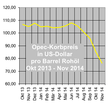Am 27. November trafen sich die Mitglieder der Organisation erdölexportierender Länder (Opec) in Wien, um die Situation zu erörtern. Venezuela und andere Mitglieder des Kartells drängten auf eine Reduzierung der Förderung, um die Preise wieder nach oben zu treiben. Saudi-Arabien setzte jedoch durch, daß es bei der derzeitigen täglichen Fördermenge von 30,6 Millionen Barrel bleibt (1 Barrel = 159 Liter). Das dominierende Opec-Land vertrat die Ansicht, der Markt werde sich von allein stabilisieren. Der Ölpreis fiel daraufhin noch weiter. Das Barrel Brent verbilligte sich bis auf 71,25 Dollar.