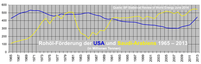 Infolge des Schieferöl-Frackings ist die Ölförderung der USA, die seit den siebziger Jahren rückläufig war und 2008 nur noch 302,3 Millionen Tonnen betrug, bis 2013 auf 446,2 Millionen Tonnen gestiegen und dürfte in diesem Jahr sogar die Förderung Saudi-Arabiens übertreffen. |