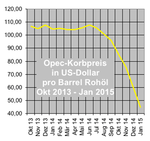 Die seit Sommer vorigen Jahres andauernde Talfahrt der Rohöl-Preise (141101) hat den Opec-Korbpreis inzwischen mehr als halbiert (siehe Grafik). Entsprechend sanken auch die Preise für das Barrel "Brent" aus der Nordsee und andere Sorten. Treibende Kraft hinter dem Überangebot ist Saudi-Arabien. Es hat den Preiswettkampf hauptsächlich deshalb entfacht, um die Gewinnung von Schieferöl per "Fracking" unrentabel zu machen. Mit dieser kostspieligen Technik haben die USA ihre eigene Ölförderung, die seit den siebziger Jahren rückläufig war, wieder stark erhöhen können. Im vergangenen Jahr übertrafen sie zeitweilig sogar die Förderung Saudi-Arabiens und Rußlands.