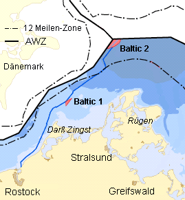 Baltic 2 liegt außerhalb der 12-Meilen-Zone an einer Stelle, wo die "Ausschließlichen Wirtschaftszonen" Deutschlands, Dänemarks und Schwedens aufeinandertreffen. Die Netzanbindung (blau) erfolgt über Baltic 1. |