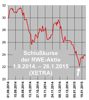 Bis zum 15. Januar war der Kurs der RWE-Aktie auf 22,35 gesunken – den tiefsten Wert seit über elf Jahren (Pfeil). Die Ankündigung des DEA-Verkaufs ließ ihn wieder leicht ansteigen. |