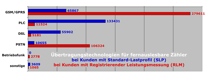 "Intelligente Stromzähler" registrieren nicht nur Leistung und Arbeit, sondern ermöglichen auch die Auswertung und Fernauslesung der Daten, was ihre Einbindung in ein Kommunikationsnetz voraussetzt. Wie diese Zahlen der Bundesnetzagentur zeigen, waren 2013 insgesamt 406.483 Industriekunden (RLM) und 269.464 Haushaltskunden (SLP) mit fernausgelesenen Zählern ausgestattet. Die Industriekunden nutzten für die Datenübertragung meistens den Mobilfunk (GSM/GPRS) oder die normale Telefonleitung (PSTM). Bei Haushaltskunden standen dagegen noch immer Powerline-Techniken (PLC) im Vordergrund, wie sie Vattenfall (071113), die EnBW (081013) oder RWE (080214) eine Zeitlang forcierten. Es folgten Mobilfunk-Anwendungen und die Nutzung des Telefon-Festnetzes per DSL. |