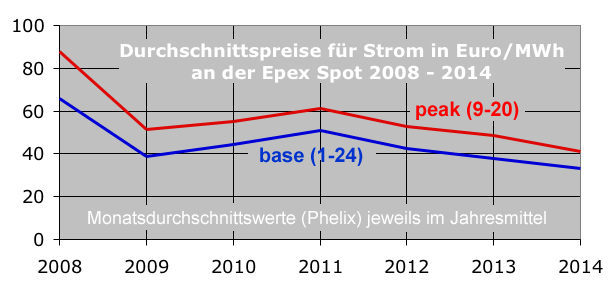 Ende 2008 setzte an der Börse ein starker Rückgang der Strompreise ein. Im wesentlichen war dies auf die damals beginnende Änderung des EEG-Abrechnungsverfahrens bzw. die Verramschung des EEG-Stroms an der Börse zurückzuführen (091201). Bei den Haushaltskunden kam der Rückgang freilich nicht an (090403). Die Stromrechnungen wurden sogar noch höher (091103), zumal dann auch bald die EEG-Kosten zu explodieren begannen (101001), denn der Rückgang der Börsen-Strompreise kam nur den Stromvertrieben zugute, während er die Verbraucher über zusätzliche EEG-Kosten belastete (120204, 120806). |