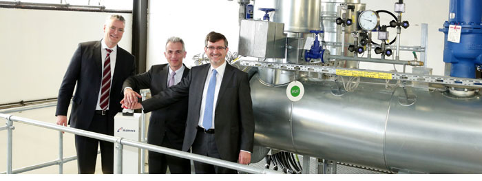 Der gigantische Durchlauferhitzer im Heizkraftwerk Niederrad kann bis zu 8 MW elektrische Leistung zu Fernwärme "verbraten". Den symbolischen Startknopf drücken hier der Mainova-Vorstandsvorsitzende Alsheimer, der Frankfurter Oberbürgermeister Feldmann und Mainova-Technikvorstand Birkner (v.l.n.r.). Foto: Mainova |